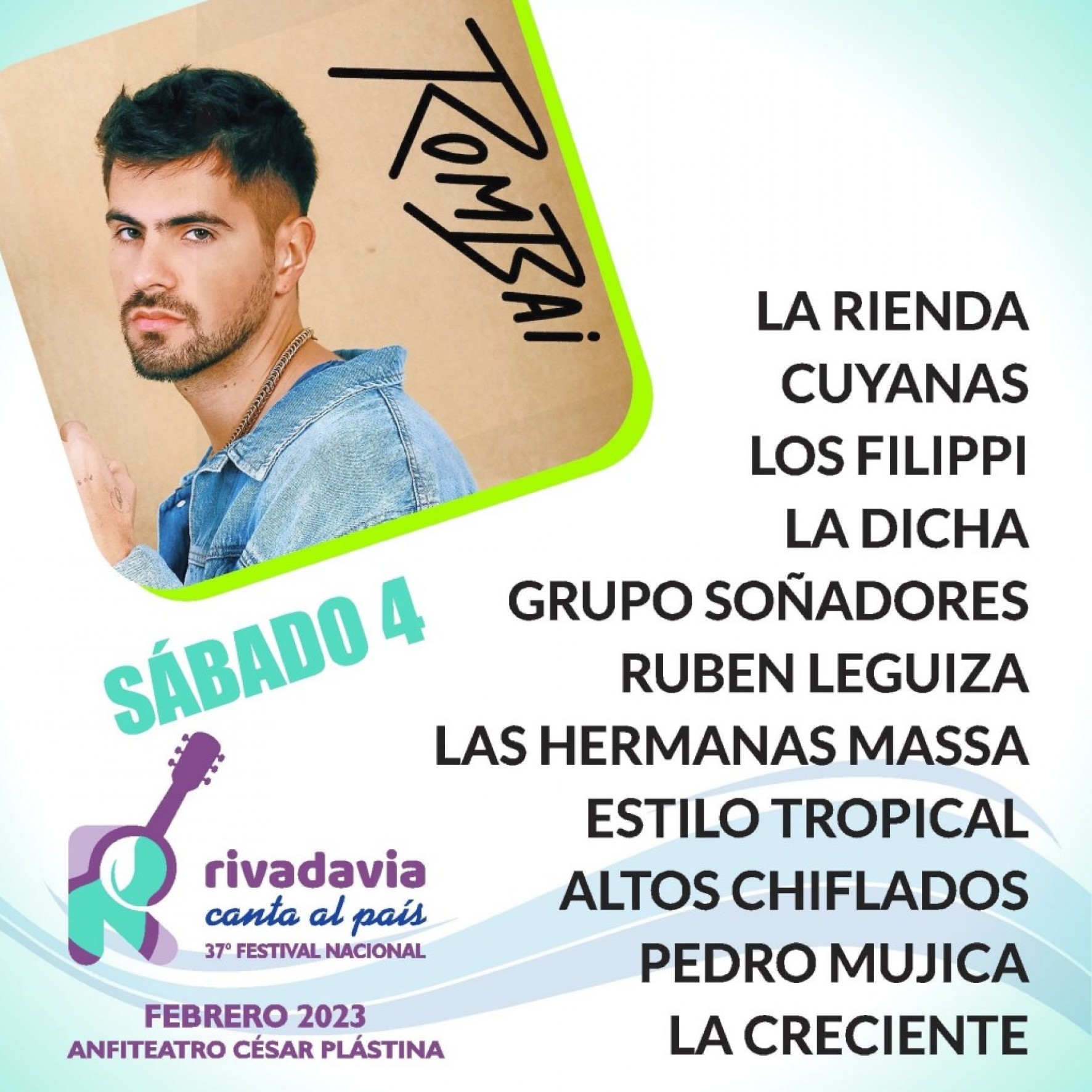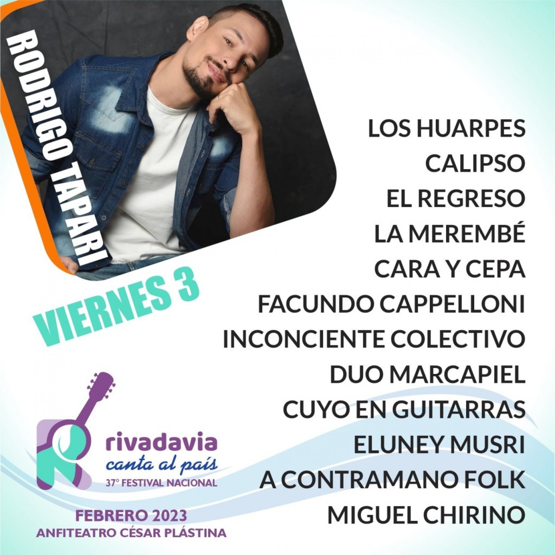 Primera noche del Festival Rivadavia Canta al País con la presencia de Los Huarpes, Calipso, El Regreso, La Merembé, Cara y Cepa, Facundo Cappelloni, Inconsciente colectivo, Duo Marcapiel, Cuyo Guitarras, Eluney Musri, A Contramano Folk, Miguel Chirino y la actuación estelar de Rodrigo Tapari.